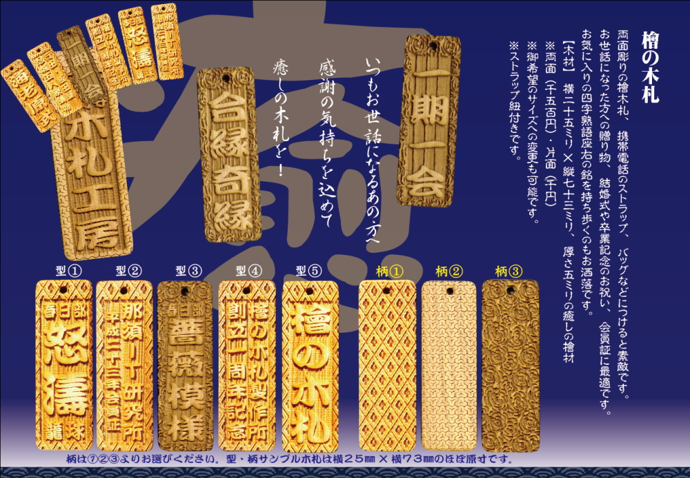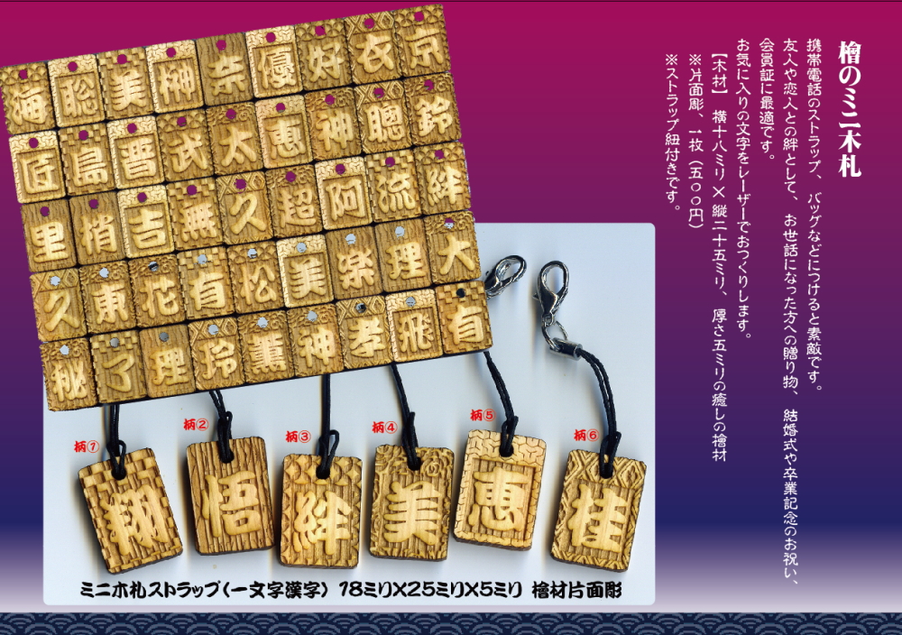 ※ストラップ付 各柄 1枚 \500 発売開始 御希望の文字をレーザーで加工いたします。